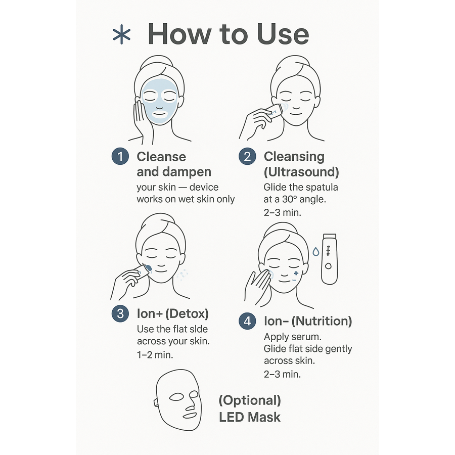 Specially engineered to unclog pores, remove buildup, and boost product absorption, this device uses 24,000Hz ultrasonic waves + ion technology to transform tired, congested skin into a smooth, glowing canvas.